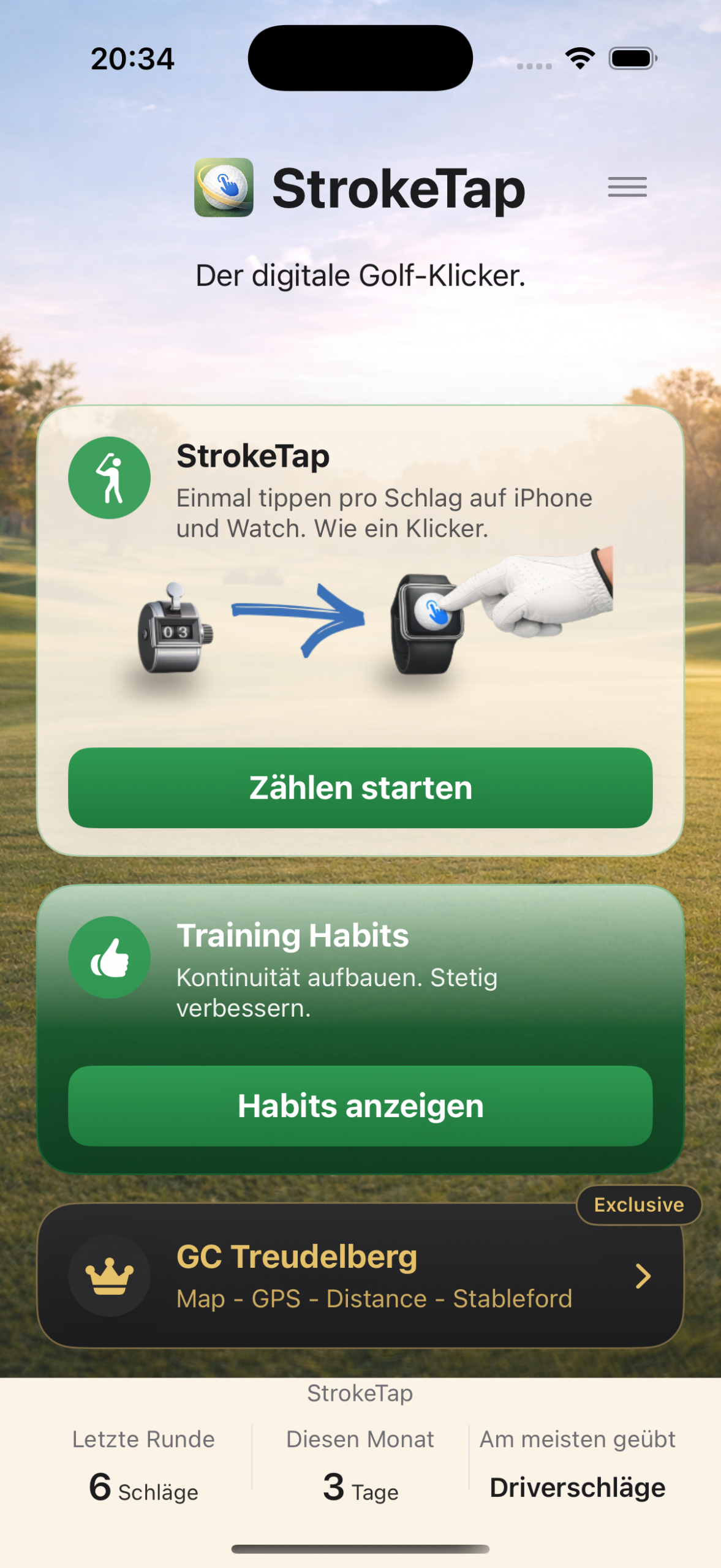 StrokeTap ist die radikal einfache Scoring-App ( Golfschläge zählen App ) für Golfer, die sich auf ihr Spiel konzentrieren wollen. Kein Zettel, kein Klicker, kein Gefummel. Jeder Schlag sitzt – und wird sauber erfasst. Deine Runden bleiben übersichtlich gespeichert, jederzeit abrufbar.