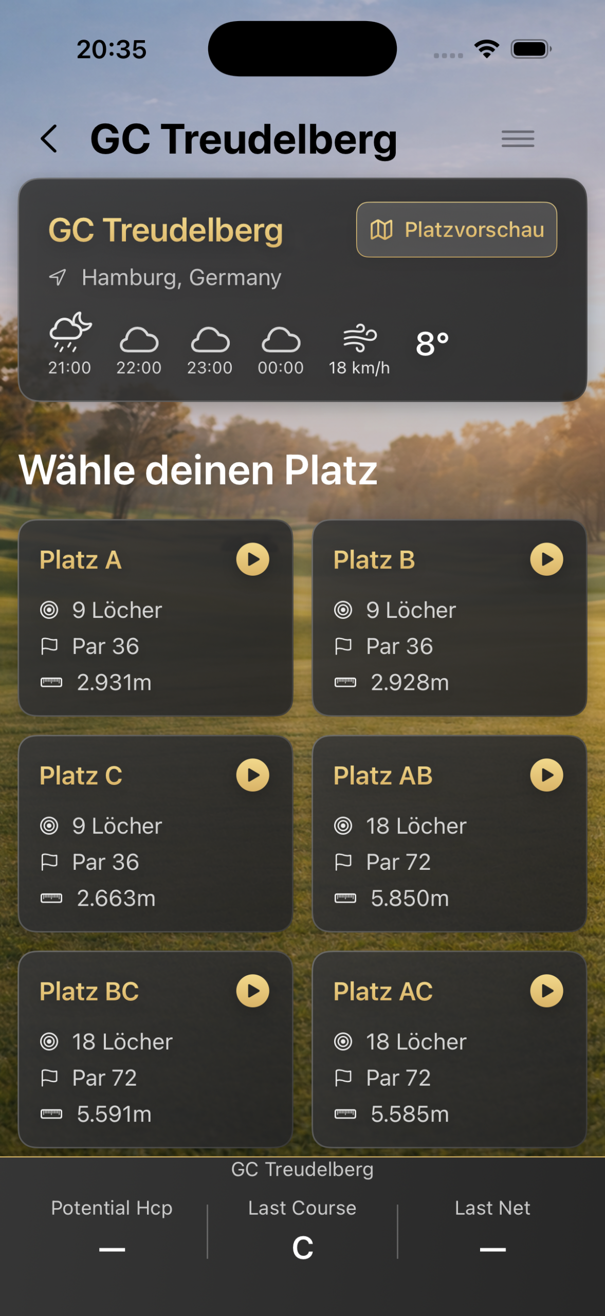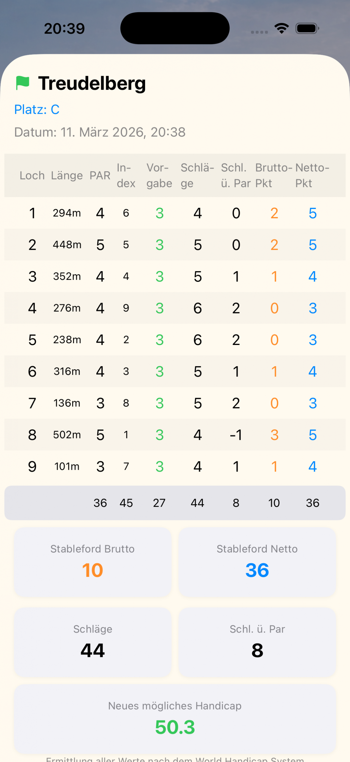 Sieh jede Bahn per GPS und Karte, kenne deine exakten Distanzen zum Green und behalte Scorecard und Stableford-Punkte live während der Runde im Blick. Nach dem Spiel teilst du deine Auswertung oder druckst sie aus – klar, präzise, golfergerecht. So wird jede Runde messbar besser.
